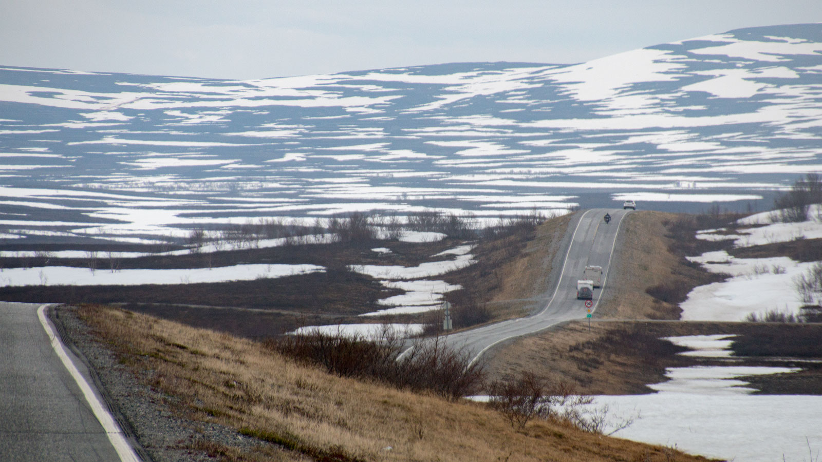 Aus dem Radio erklingen Schweizer Rockmundart-Lieder vom iPod von Anita, wir bestaunen die Gegend weiterhin, Anita macht Fotos aus dem fahrenden Auto und manchmal stoppen wir kurz an den unzähligen Parkplätzen entlang der E6 (bei jedem gibt’s was schönes zu sehen). In Skaidi ent- und versorgen wir uns zum zweiten Mal und hinter uns fährt ein deutsches Womo an und womi6063 steigt aus und gibt sich aus dem Womoforum zu erkennen. Jetzt werden wir schon in Norwegen erkannt und ich fühle mich wie ein Star! Nach einem kurzen Gespräch geht’s für beide wieder weiter, ich denke, wir treffen uns nochmals, da wir in etwa die gleiche Route und den gleichen Zeitplan haben.