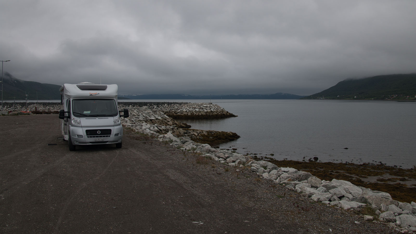 Irgendwann denken wir, dass wir uns jetzt auf die Suche nach einem Stellplatz am Meer machen. Aussicht muss keine sein, da das Wetter immer noch neblig und feucht ist. Schon 1 km später kommt ein Wegweiser mit einem Wohnmobil drauf und wir zweigen ab. Nun sind wir in Sandbukt auf einem offiziellen Stellplatz beim Häfelchen. So müssen wir nicht mehr suchen, können Wasser verschwenden und auch die Toilette morgen wieder leeren. Ich habe unsere Reise mit dem ADAC-Stellplatz-App mitgeplant und für Norwegen sind da nach Gefühl nur 10% der Stellplätze und Campingplätze verzeichnet. Es hat also viel mehr, wie in diesem Verzeichnis.