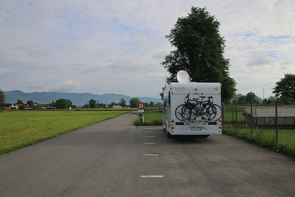 In Oberriet parken wir zuerst bei einer grossen Firma. Aber irgendwie kriegen wir da keinen Satelittenempfang, obwohl alles frei ist. Liegt es am schlechten Wetter? Kann aber irgendwie nicht sein, da wir zu Hause auch bei jedem Wetter empfang haben. Etwas später fahren wir zur Sporthalle, nur einige 100m weiter weg, um zu schauen, ob dort der Empfang besser ist. Dort ist es dann kein Problem und wir richten uns ein.