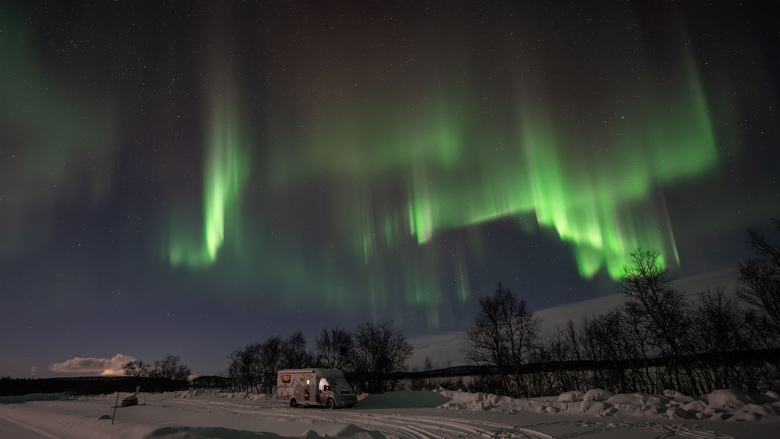 Schlaf fanden wir nicht viel, obwohl die Nacht sehr ruhig und ohne Windgeräusche war. Es wäre ein Träumchen gewesen, so ruhig und tief zu schlafen, wenn nicht nach den 10cm Neuschnee plötzlich etwas grünes durch die Womofenster geschimmert hätte. Wir natürlich warm eingepackt sofort nach draussen und dann nur wir zwei, unser Womo und die Nordlichter! Keine Strassenlaterne, kein anderes Licht, ausser der Halbmond und die Sterne. Nach vielen Fotos liessen wir den Fotoapparat ruhen und wir genossen einfach die Lichtschau am Himmel. Genau über uns, manchmal vorne, hinten und oben gleichzeitig, manchmal schnell tanzend, dann wieder fast unbeweglich. Um alles zu sehen, liegen wir im Rücken im Schnee und geniessen.