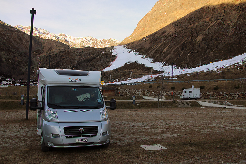 Die Hinfahrt über Arlberg, Reschenpass und das Vinschgau verläuft wie am Schnürchen. Schnee sehen wir keinen, nicht mal auf den Berggipfeln und im Vinschgau denken wir, mit unseren Skis sind wir im falschen Film. Danach geht es aber steil aufwärts (ich bin echt froh, dass es kein Schnee hat, den die Ketten habe ich zu Hause vergessen) bis wir im Schlanstal bei Kurzras auf dem Stellplatz ankommen. Und tatsächlich, wir sehen zwei weisse Pisten, die vom Berg runter kommen. Es hat tatsächlich Skifahrer hier, wir sind also richtig.