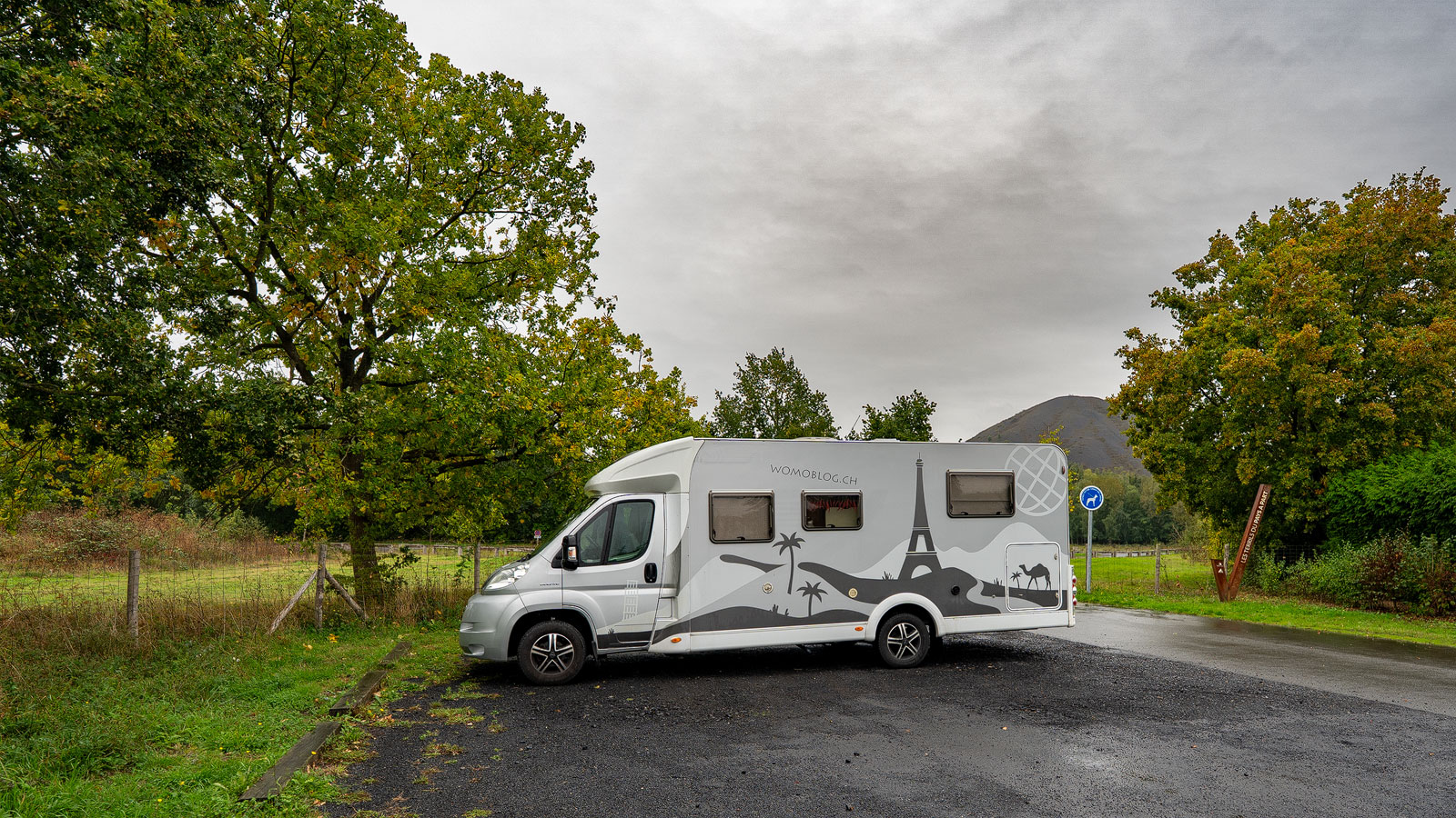 Wir kommen dann mit einem Verlust von zwei Stunden (eine wegen Verspätung, eine wegen der Zeitumstellung) in Frankreich an und fahren darum nur noch rund 80km bis Haillicourt. So stoppen wir an einem kleinen, schönen Parkplatz neben den terrils jumeaux. Für alle, die mit dem Begriff nichts anfangen können: Das sind keine Berge, die die Natur über Jahrtausende geschaffen hat, sondern künstliche Hügel aus der Zeit des Kohlebergbaus. Und glaubt mir, sie haben es in sich! Die Terrils Jumeaux – die „Zwillingsterrils“ – ragen wie zwei schwarze Kegel in den Himmel. Wir staunen nicht schlecht, als wir unten auf dem Parkplatz stehen und die beiden Kolosse vor uns sehen.