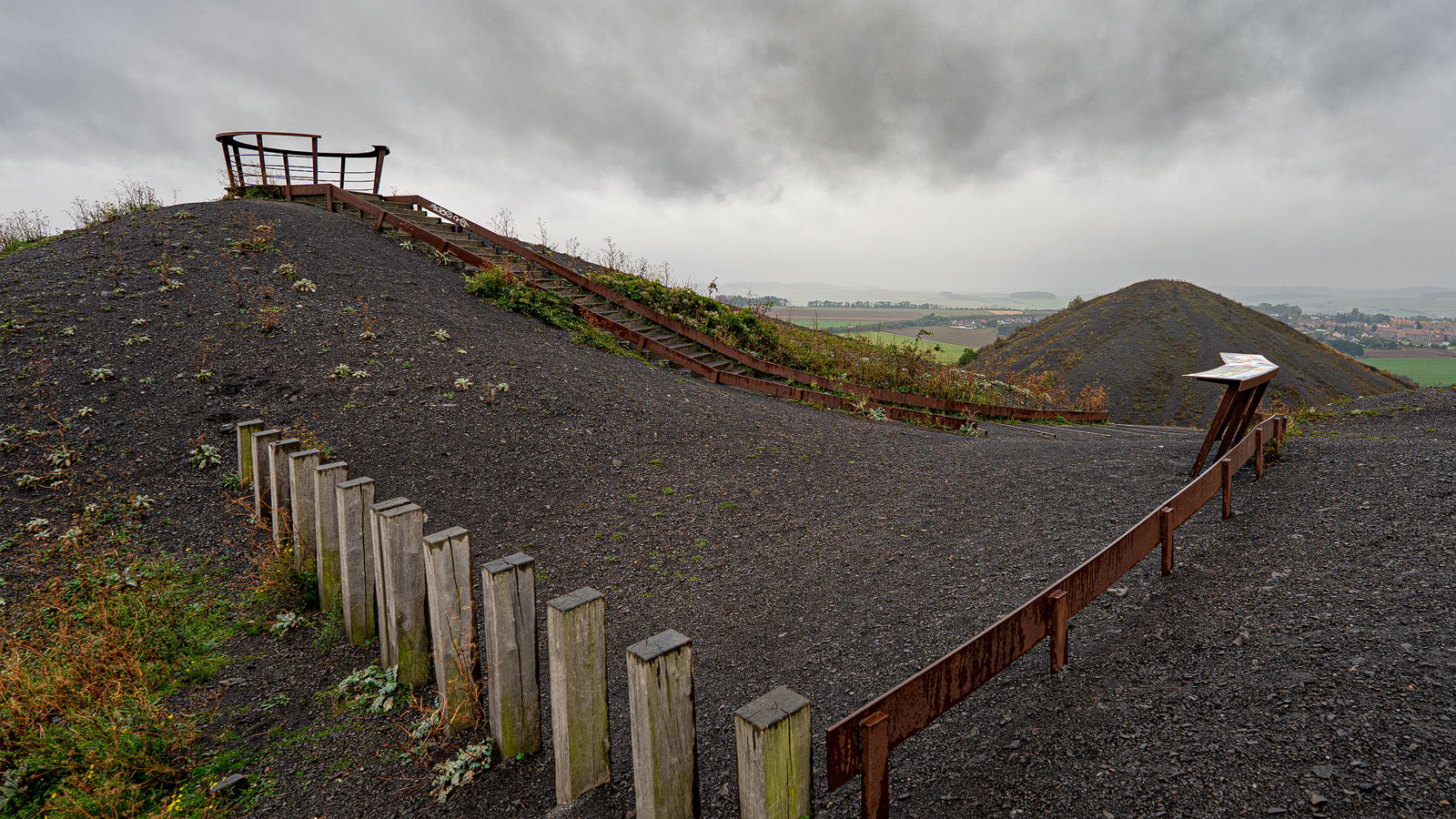 Oben angekommen schifft und stürmt es ziemlich, nichts mit einem Drohnenflug und guten Fotos. Aber Eindruck machen diese künstlichen Berge schon. Es hätte noch mehr Platz hier für das Ausbruchsmaterial, aber den Minen gingen in dieser Gegend 1986 die Kohlen aus (im wörtlichen Sinne) und sie wurden geschlossen.