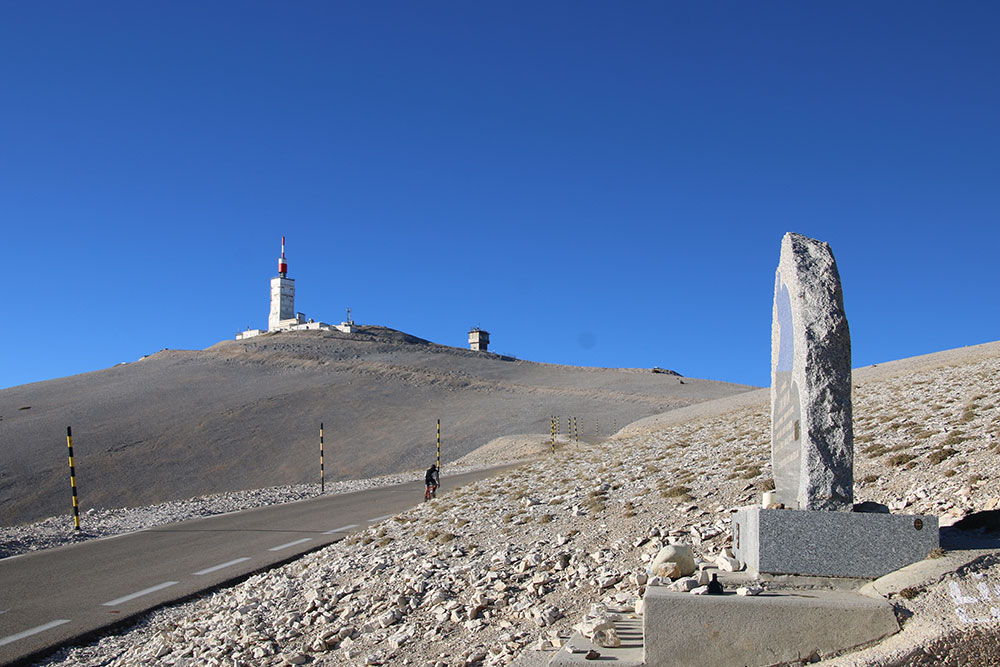 Bis jetzt hatte ich nie Zeit, die Aussicht auf diesem Berg zu geniessen, ich musste jeweils möglichst schnell in die Abfahrt stechen, damit ich die Zeit wieder aufhole, die ich den Berg hoch verloren hatte. Ich bin diesen Berg jeweils nur an den Rennen gefahren, Tour de France, Tour de Vaucluse etc. und nie im Training. So habe ich jetzt auch endlich einmal Zeit, das Denkmal von Tom Simpson zu besuchen.