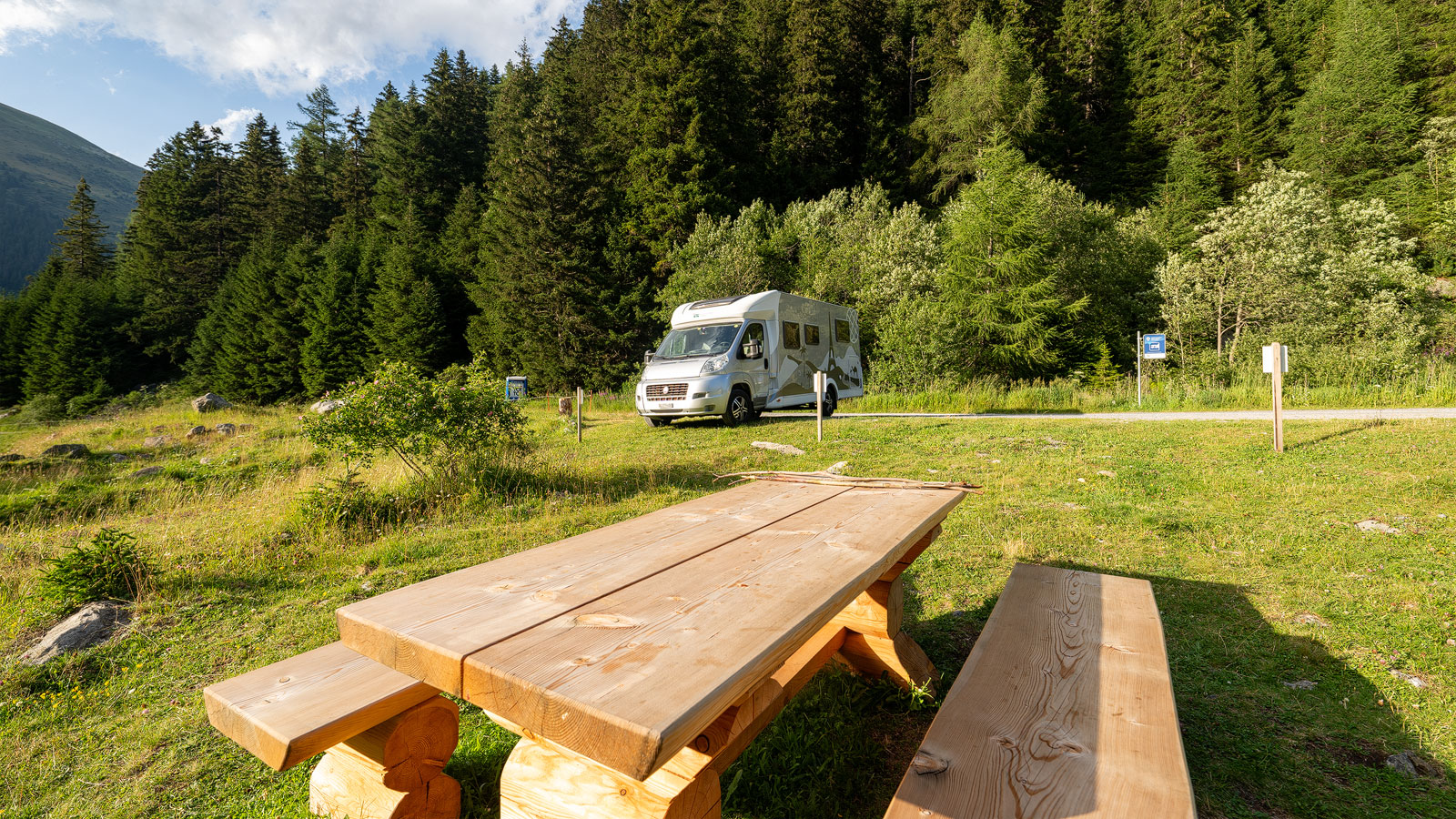 Etwas später setzen sich dann zwei Biker an den Holztisch, wo wir sofort ins Gespräch kommen. Wie es sich herausstellt, steht bei ihnen zu Hause ebenfalls ein Wohnmobil und so haben wir schnell viel Gesprächsstoff. Zwei Stunden später sitzen wir immer noch hier, haben von der Sonne verbrannte Köpfe und Arme aber schon wieder ganz viele Inputs für neue Stellplätze, weil man wieder jemand kennt, der dort das Sagen hat, der dort Platz hätte etc. Mein Notizbuch ist schon wieder voll geschrieben mit Abklärungsarbeiten.