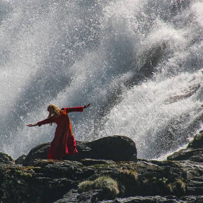 Beim Bahnhof angekommen, Fahrkarten gekauft (ziemlich teuer mit den Rädern, 400 Kronen pro Person). Aber die Eisenbahn hat eine volle Stunde für die 20km. Unterwegs wird aber am grossen Wasserfall Kjosfossen angehalten, wo wir dann sogar das Glück haben, die Unterweltgestalt Hulda zu sehen.