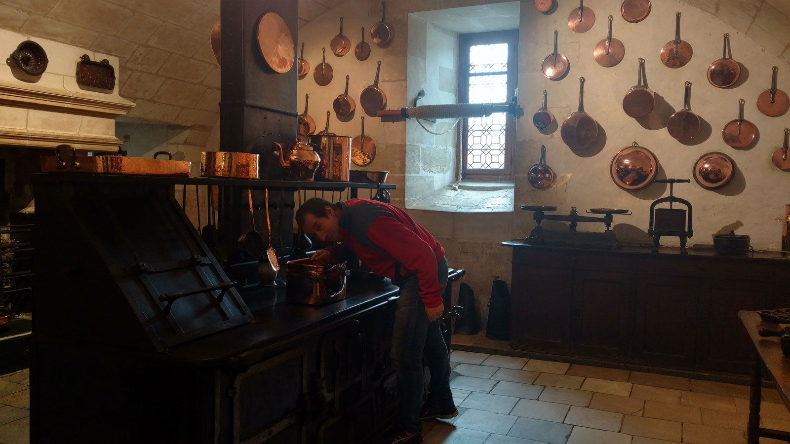 Wir fahren aber weiter ohne das Schloss zu besichtigen, denn wenn ich von aussen keine Fotos machen kann wird es für mich uninteressant. Also 45 Minuten weiter Chenonceau zum Schoss, das direkt über den Fluss gebaut wurde. Auch hier herrliche Parkmöglichkeiten für Womofahrer. Schnell haben wir den Eintritt bezahlt und schreiten durch die alte, königliche Allee Richtung Schloss. Es sieht genau so aus, wie ich es mir anhand von Fotos so vorstelle. Sehr eindrücklich, nur der angelegte Garten ist noch schöner, obwohl es Winter ist. Auch innen ist es sehr, sehr eindrücklich. Die Küche ist riesengross und noch fast vollständig eingerichtet, man kann es fast riechen, wie sie hier die herrlichen Menus für die Bankette hergerichtet haben!