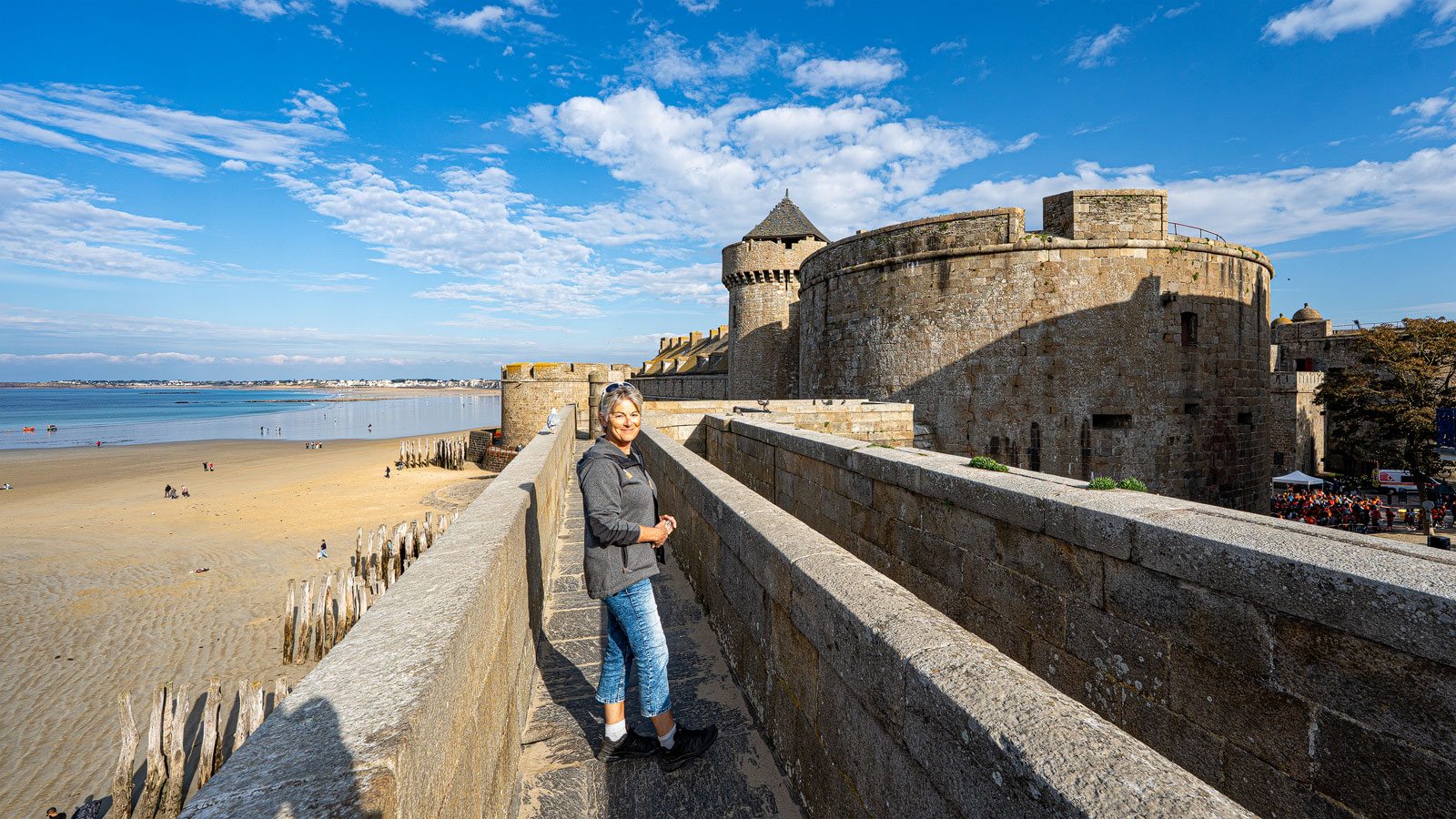 Erst danach laufen wir zum riesigen Stadttor in der noch viel grösseren Stadtmauer von Saint Malo. Die Mauer ist gewaltig, hoch wie breit und führt um die gesamte Altstadt herum. Man kann sie in der Höhe über die gesamten 2 km umrunden.